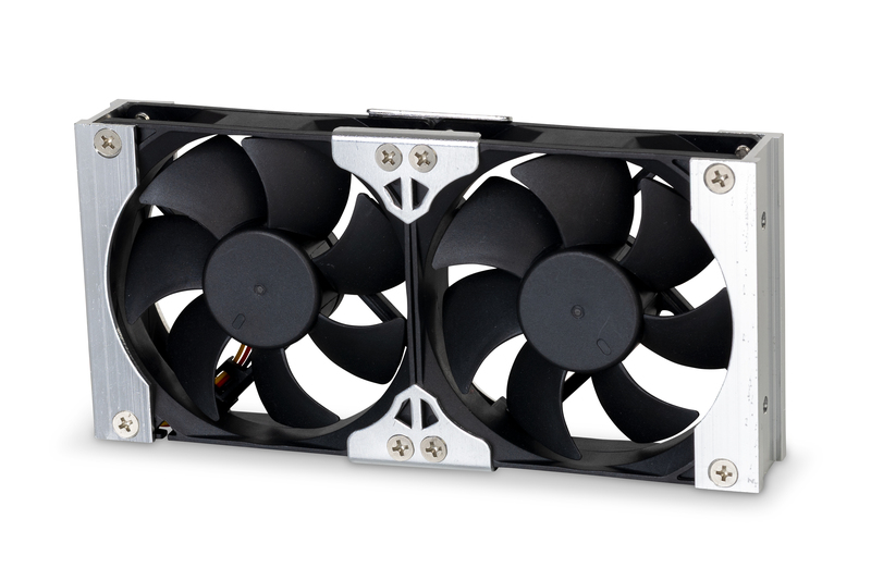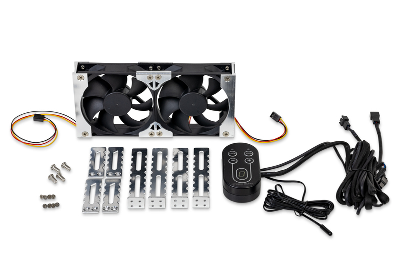 Leistungsstarker 12 V Doppellüfter inkl. Halterungen, Verkabelung (Länge: ca. 1,8 m) und Bedienteil. Die Temperaturmessung erfolgt über ein integriertes Sensorkabel (Länge: ca. 2 m).